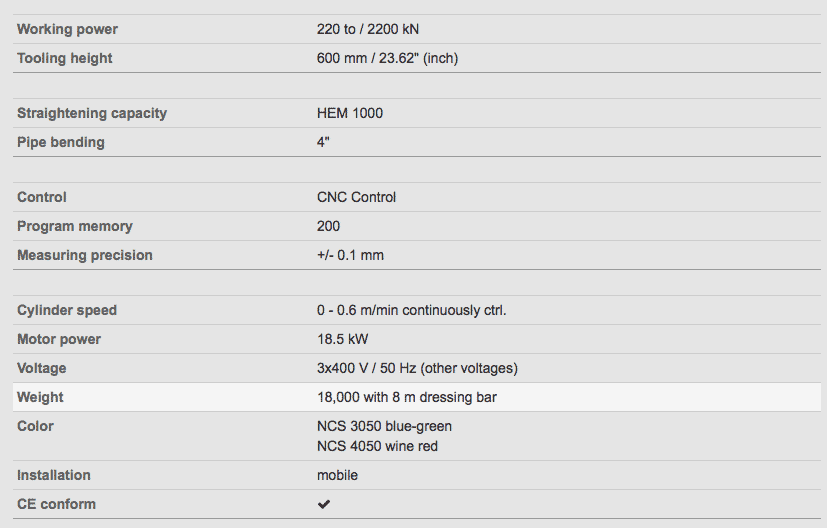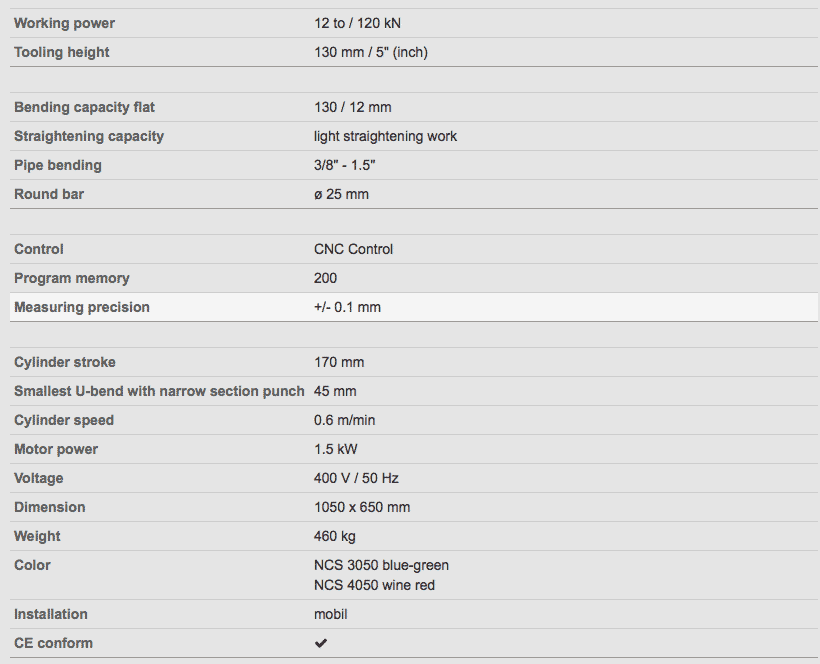 Maskinens CNC-styringssystem gør, at 200 forprogrammerede bukkeserier med op til 10 buk i hver serie kan gemmes i systemet. Programmeringen af de ønskede buk eller udretninger kan altid tilpasses i systemet med en præcision på +/- 1mm.