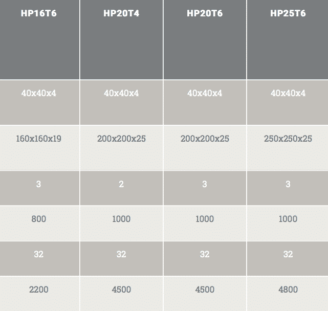 HP-serien kan tilpasses netop din produktion igennem forskellige features, størrelser og kapaciteter, og kan som standard fås i 7 varianter: