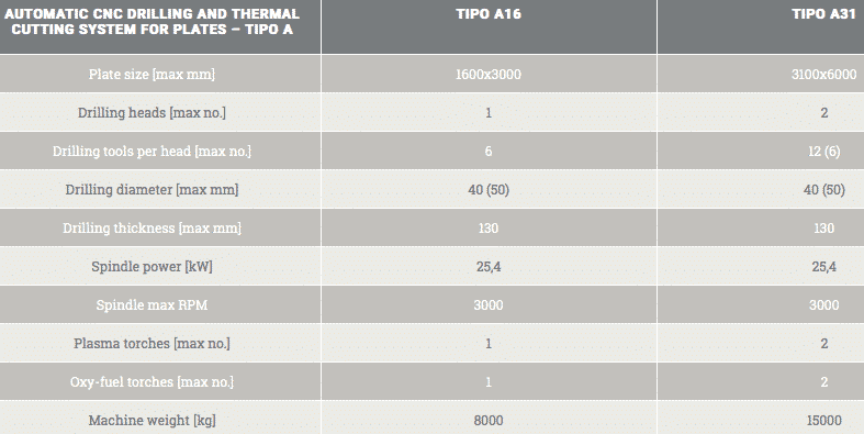 TIPO A er en meget alsidig maskine, som kan udføre en lang række opgaver indenfor bearbejdning af metalplader. Maskinen kan udstyres til at udføre henholdsvis plasmaskæring, oxygenskæring, boring, fræsning, tapping, countersinking og scribing, og alt sammen i meget tykke og store metalplader.
