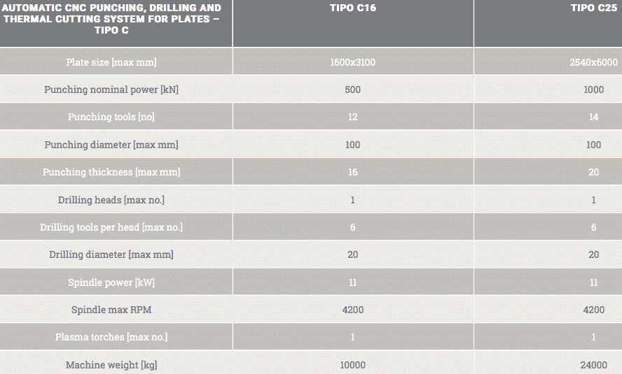 TIPO C er en meget alsidig maskine, som kan udføre en lang række af brugbare opgaver indenfor bearbejdning af metalplader. Maskinen kan udstyres til at udføre henholdsvis plasmaskæring, boring, fræsning, tapping, countersinking og scribing, og alt sammen i meget tykke og store metalplader.
